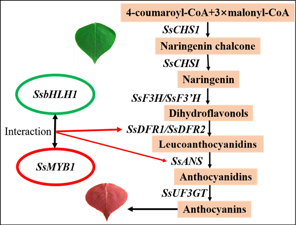 SsMYB1與SsbHLH1相互作用激活花色素苷合成和葉片變色示意圖