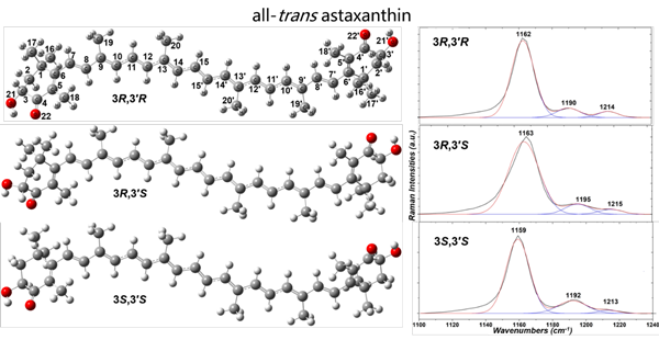 研究團(tuán)隊(duì)利用拉曼光譜技術(shù),提出一種區(qū)分左旋、右旋和內(nèi)消旋的全反式蝦青素的方法。他們發(fā)現(xiàn),利用拉曼光譜觀察到這不同手性蝦青素在1190cm-1和1215 cm-1譜帶的相對強(qiáng)度有區(qū)別,對此強(qiáng)度分析可以快速鑒別三種手性同分異構(gòu)體的蝦青素。結(jié)合DFT計(jì)算分析,推測這三種手性蝦青素由于分子間相互作用不同處于不同的晶型,由于三種分子的構(gòu)象之間不再保持鏡面對稱,從而導(dǎo)致拉曼光譜有所區(qū)別。