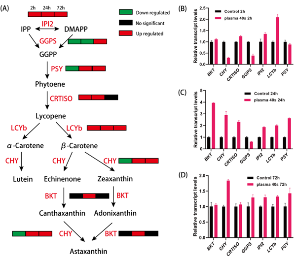 圖1. 放電等離子體作用引起蝦青素合成相關(guān)基因表達變化