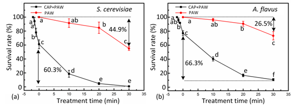 圖1:CAP與PAW聯合處理提高了對酵母和黃曲霉菌的殺滅效率