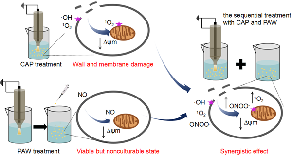 近年來,黃青研究員帶領課題組研究人員在低溫等離子體微生物消殺機理及應用方面做了系統的研究工作。在本研究中,他們提出利用大氣壓低溫等離子體(CAP)射流和由此產生的等離子體活化水(PAW)相結合的滅菌處理方式,并以處理兩種典型真菌(酵母菌和黃曲霉菌)為例,深入研究了大氣壓低溫等離子體,等離子體活化水以及兩者聯合滅菌機理。他們發現,等離子體與等離子體活化水聯合處理具有協同效應,能夠有效提高殺菌效率(圖1)。為了闡明這種協同作用機制,他們進一步研究了兩者產生的RONS(·OH,1O2,H2O2,ONOO-,NO2-,NO3-)情況,特別探討了不同處理方式下,胞內各種RONS(·OH,1O2,H2O2,NO,ONOO-)變化情況。研究發現,在單獨等離子體射流處理下,主要是ROS起作用,·OH和1O2能夠通過破壞壁膜結構導致真菌失活;而單獨等離子體活化水并不能直接導致真菌壁膜損傷,但是容易導致真菌處于一種不可培養狀態(VBNC)。等離子體與等離子體活化水的聯合處理具有協同效應,這是因為在第一階段等離子體處理下,真菌的壁膜結構受到損傷;而在隨后的等離子體活化水處理中,更多的1O2和ONOO- 進入細胞,并對線粒體和能量代謝系統造成不可逆損傷,從而導致真菌失活(圖2)。